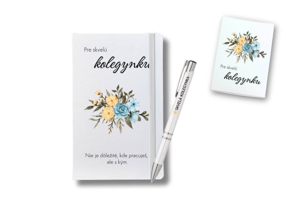 Každý set obsahuje linajkový zápisník formátu A6, kvalitné plastové pero s potlačou a darčekovú krabičku v rovnakej grafike. Vďaka viacerým dostupným motívom si môžete vybrať ten, ktorý sa k vašej kolegyni najviac hodí.