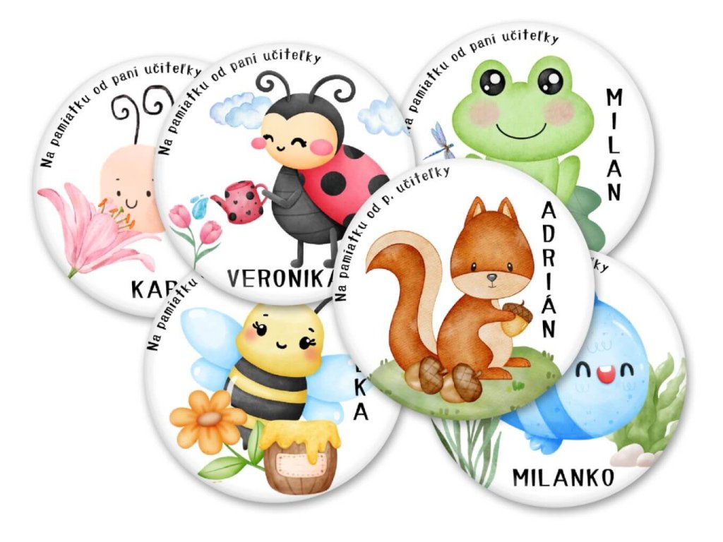 Detské odznaky alebo magnetky vyrábam na mieru s menami deti. Sú naozaj skvelé ako malý darček od učiteľky na začiatku alebo konci roka a iné špeciálne príležitosti. Na každom odznaku je spoločný nápis "NA PAMIATKU OD PANI UČITEĽKY" a následne meno dieťatka zo škôlky. V rámci personalizácie okrem samotných mien je možné zameniť aj spoločný text, stačí ho napísať do poznámky pri objednávke. Samozrejme nezabudnite do poznámky napísať aj menný zoznam detičiek.