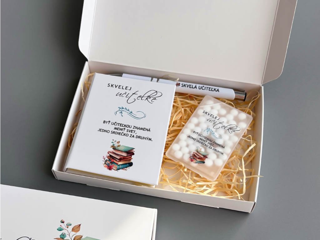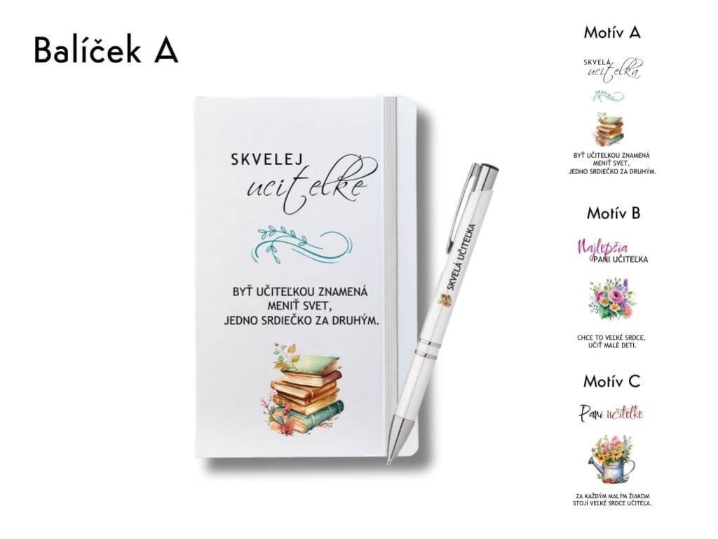 ✅ balíček A: zápisník A6, pero, darčeková krabička s potlačou